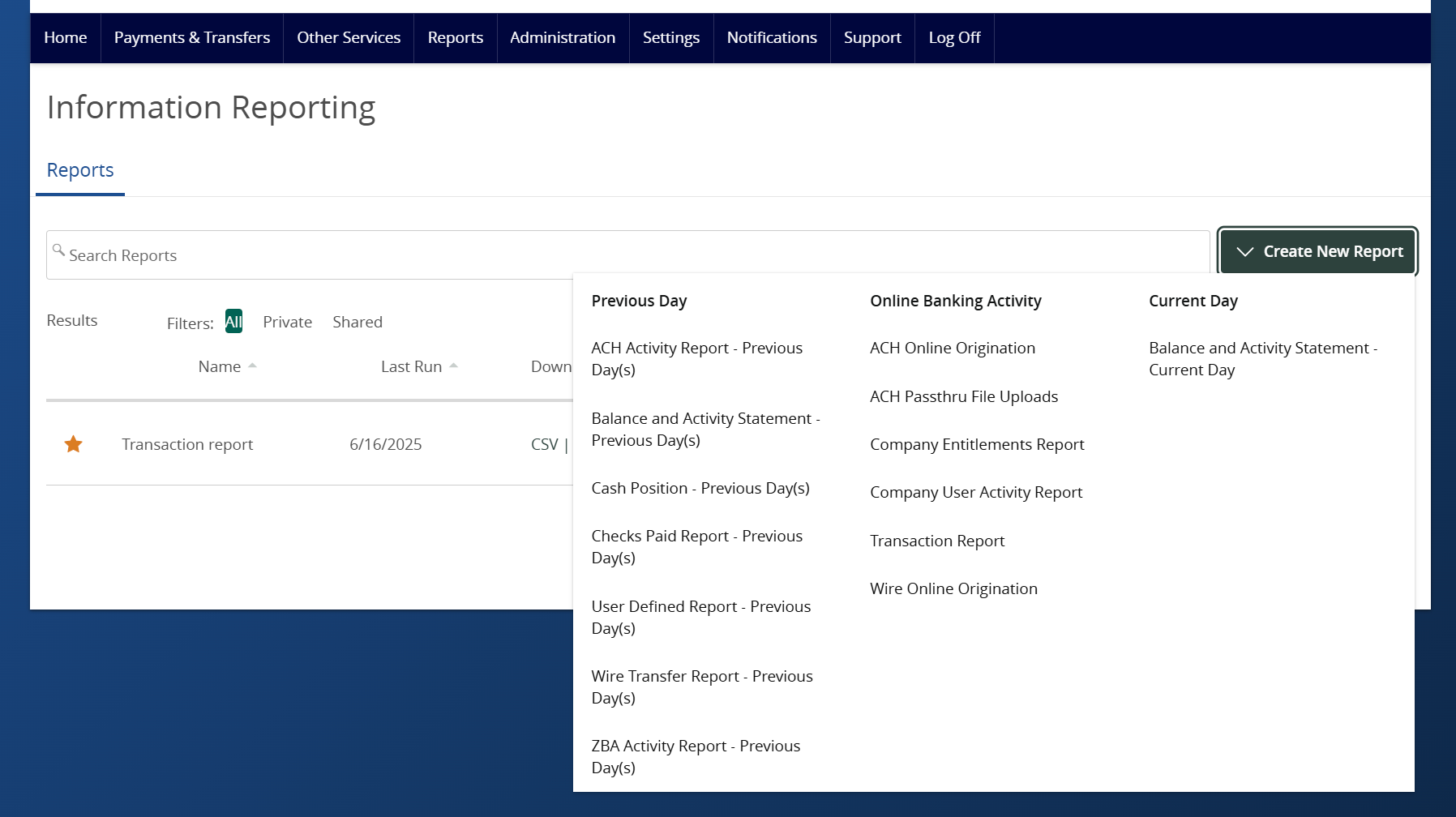 In Reports > Information Reporting, a variety of predefined and/or customizable reporting is available by default depending on your service tier. You can customize reports by choosing your own data fields, filter and sort by criteria and combine multiple accounts into a single report. These options enable you to create reports that provide visibility and insights into your banking activity based on your business needs.